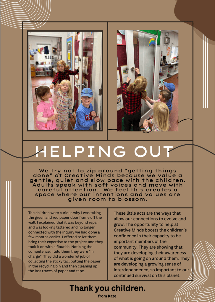 Helping Out Posted on October 4, 2024 by creative minds early learning centre 0 Share this: Click to share on X (Opens in new window) X Click to share on Facebook (Opens in new window) Facebook Like Loading... Related