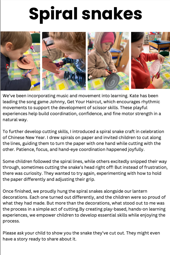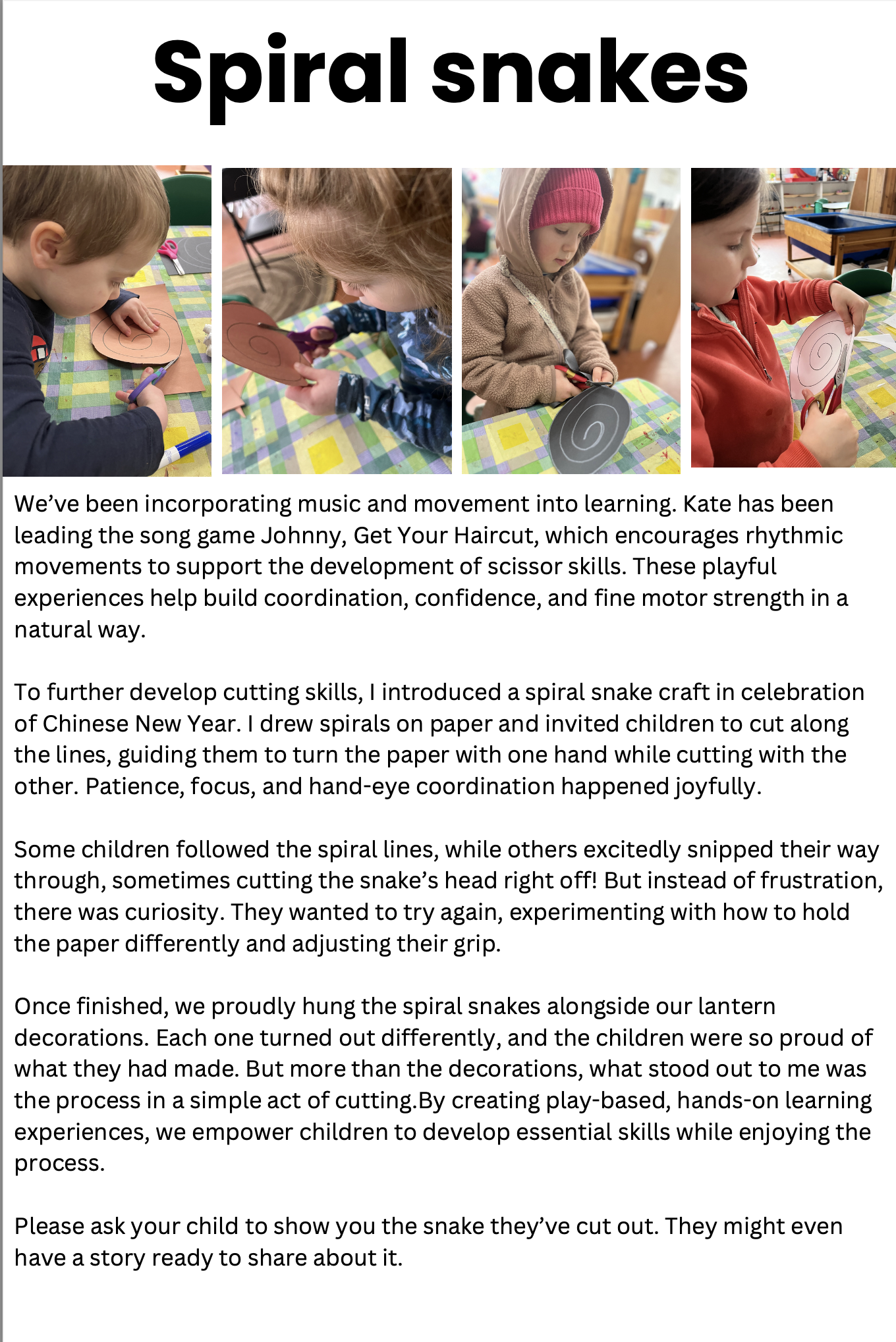 Spiral Snakes Posted on February 19, 2025 by creative minds early learning centre 0 Share this: Click to share on X (Opens in new window) X Click to share on Facebook (Opens in new window) Facebook Like Loading... Related